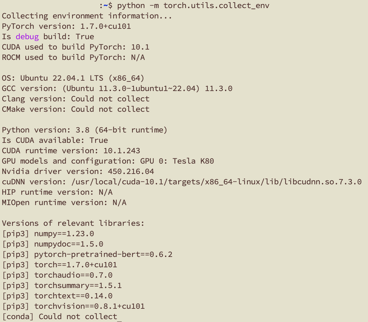 현재 설정되어 있는 Cuda, cudnn, nvidia-driver, gpu 모델, torch version, python version은 아래와 같았다.