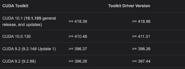 -> 맞음! 처음에 nvidia-driver-390을 깔았다가 에러가 나길래 418을 깔았었다. 근데 위 링크를 보고 cuda version이 지원하는 driver버전을 찾아보니 아래와 같았다. 내가 쓰고 있던 driver는 418.39보다 작았다.