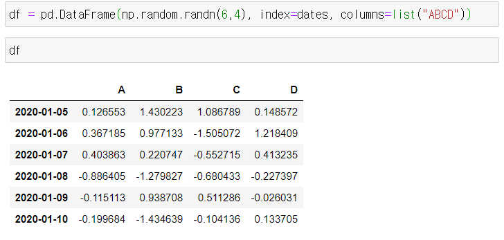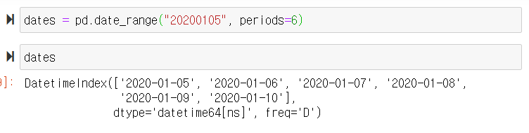 1) 우선, date_range()를 사용하여 "20200105"부터 6일을 dates에 저장해주고, 출력한 모습이다.